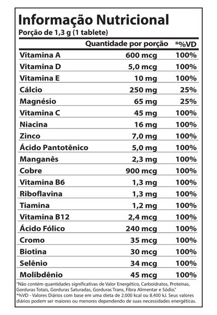 - Ingredientes: Minerais, Vitaminas do Complexo B, Vitamina C, Vitaminas Lipossolúveis.