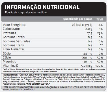 - ELLA WHEY é um suplemento com características proteicas composto por Whey Protein Concentrado (WPC), Whey Protein Isolado (WPI), Whey Protein Hidrolisado (WPH) e colágeno hidrolisado.
