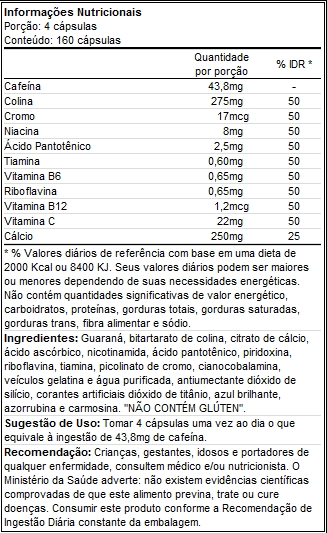 - Ingredientes: Cálcio, Cafeína Natural proveniente do Guaraná em Pó, Cromo, Vitaminas do Complexo B e Vitamina C.
